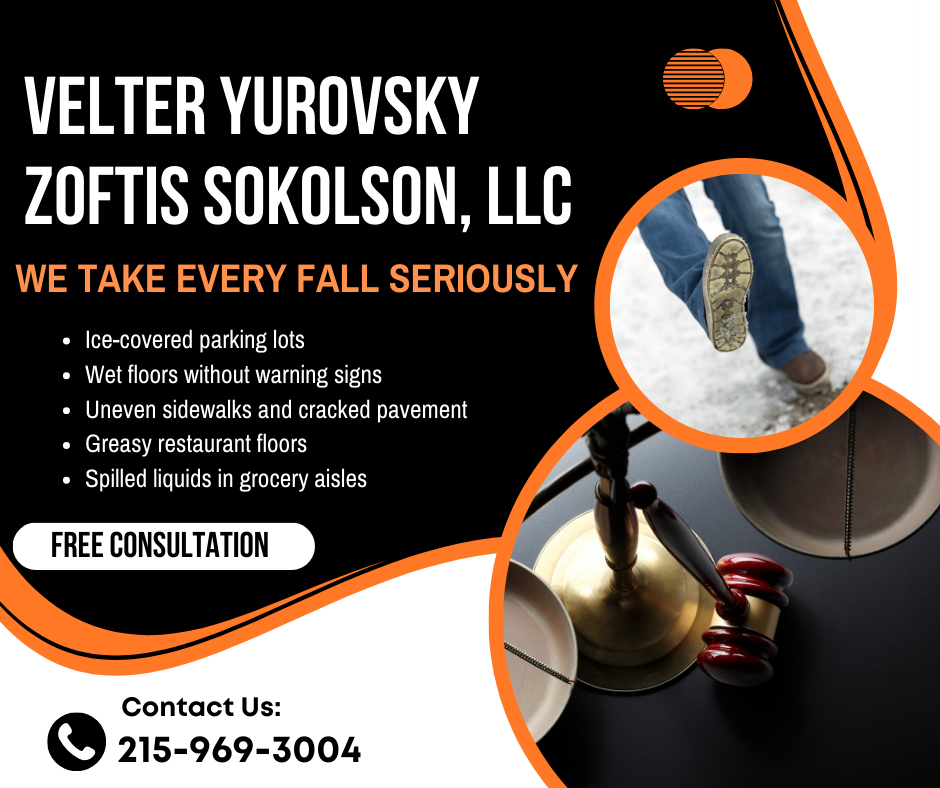 Did you experience an injury due to a Slip and Fall accident? Don't delay, contact a reputable Slip and Fall Lawyer from the law firm of Velter Yurovsky Zoftis Sokolson, LLC at 215-969-3004 for a no-obligation consultation.